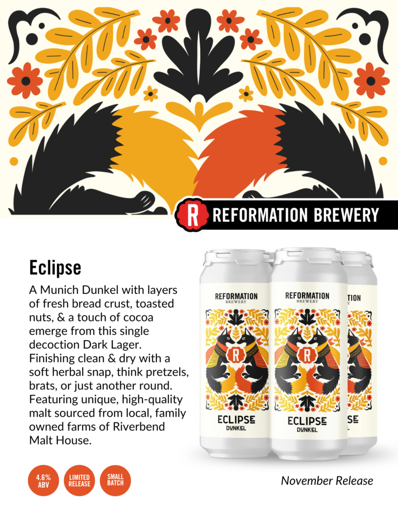 Munich Dunkel | 4.6% Layers of fresh bread crust, toasted nuts, & a touch of cocoa. Finishes clean & dry with a soft herbal snap.